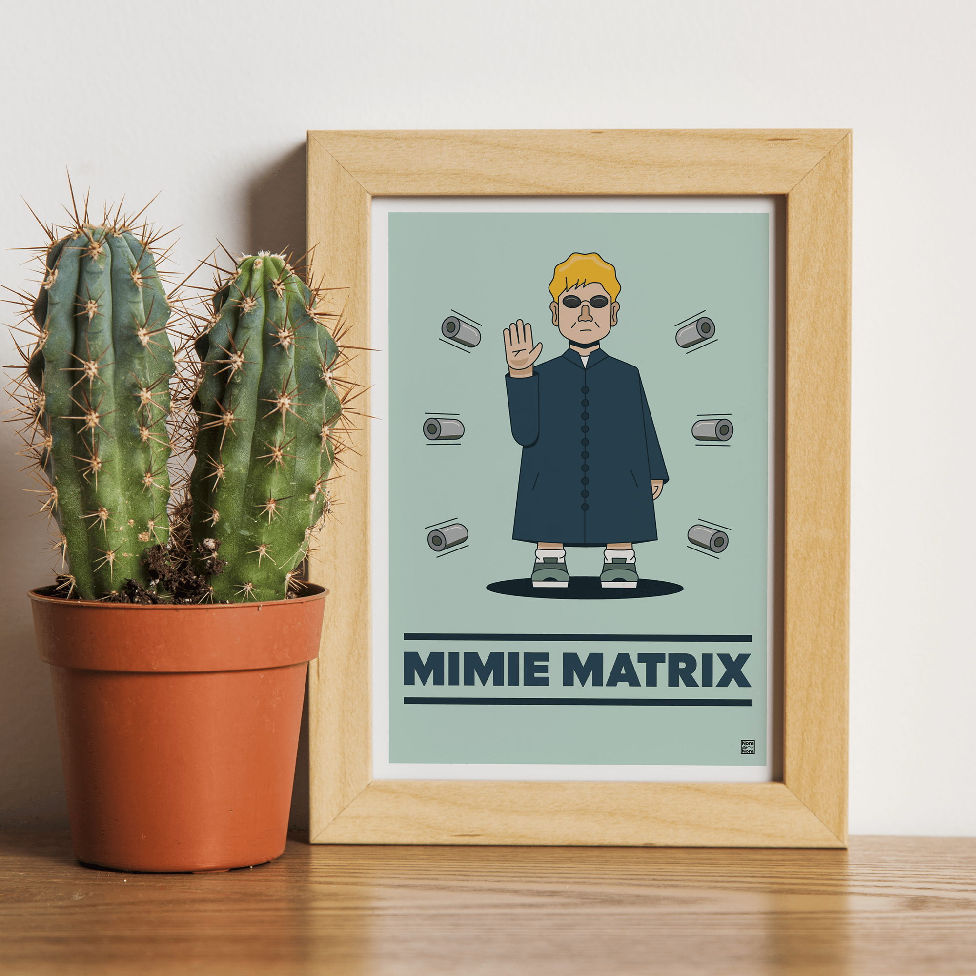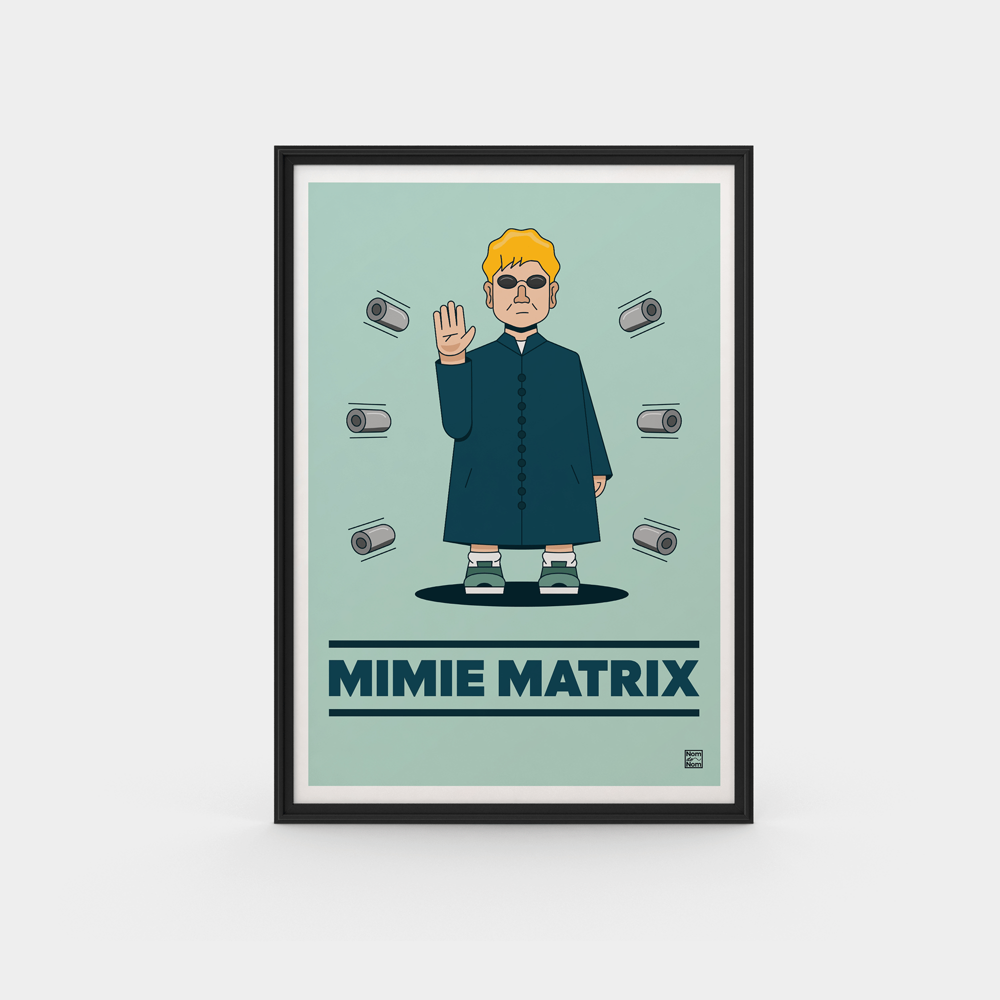 Mimie, elle est pas là pour plaisanter. Costume sombre, lunettes noires, posture iconique. Une affiche qui mélange culture pop et mauvaise attitude parfaitement assumée.